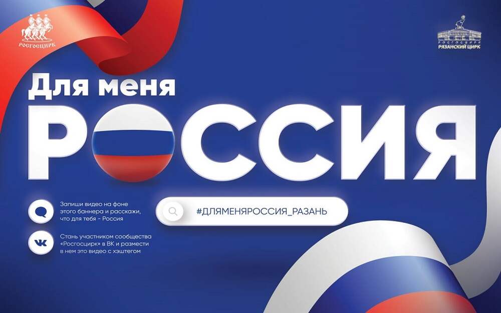 Всероссийская акция «Для меня Россия…» - проект «Росгосцирка». Каждому желающему предлагают сделать короткое видео о своей стране, выложить его во ВКонтакте с тегом #ДляМеняРоссия_Рязань. В результате трем участникам подарят билеты на следующую программу, которая пройдет в Рязанском цирке. Имена... Далее
