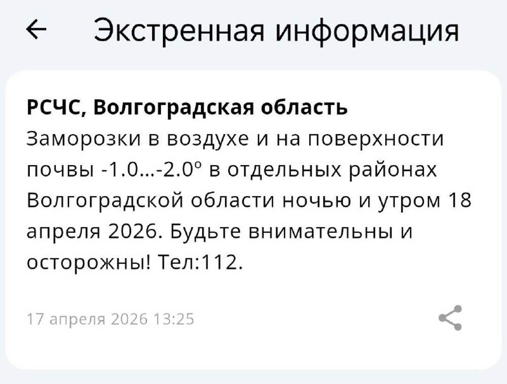 ⚠️ ШТОРМОВОЕ ПРЕДУПРЕЖДЕНИЕ: ЗАМОРОЗКИ По данным Волгоградского ЦГМС, во второй половине ночи и утром 18 апреля (суббота) в отдельных районах Волгоградской области ожидаются заморозки: