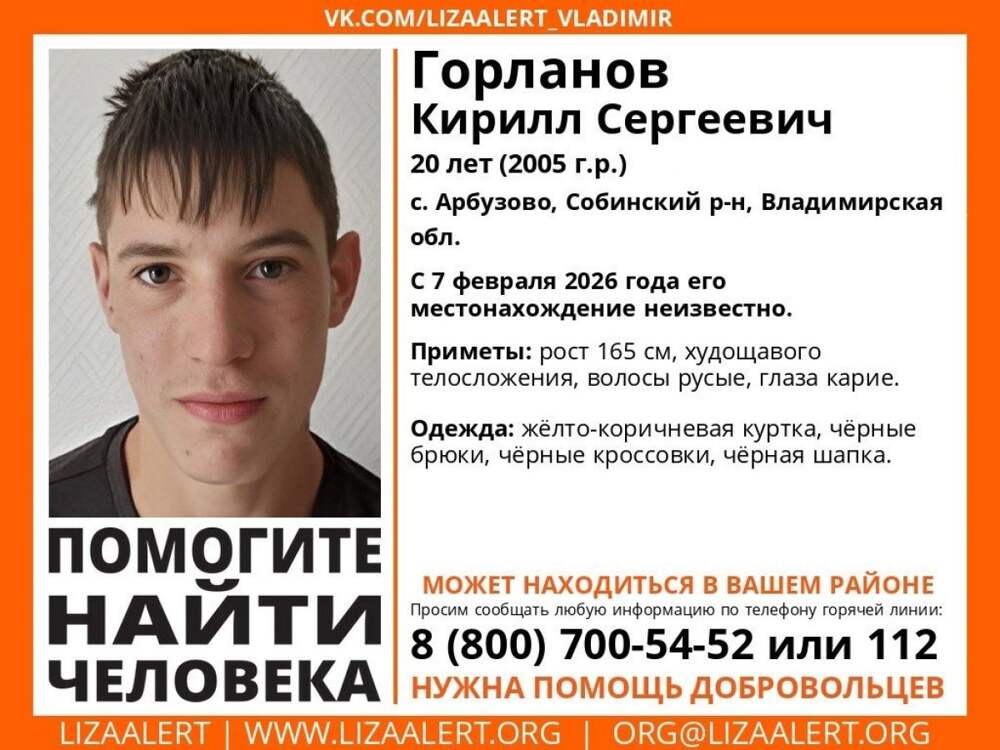В Арбузово пропал 20-летний Кирилл Горланов. Волонтеры «ЛизаАлерт» просят помощи в поисках. Подробности внешности и одежды парня — в материале. В субботу в селе Арбузово Собинского района пропал юноша, сообщают волонтеры владимирского отряда «ЛизаАлерт». Пропавшему Кириллу Горланову 20 лет. Он... Далее