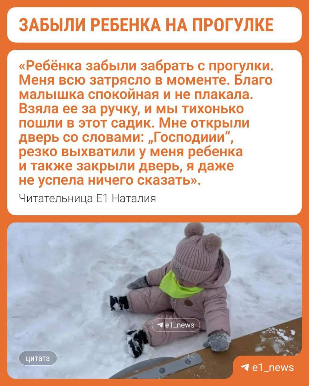 Забыли в сугробе: в Академическом прохожая спасла малышку, которую не забрали с прогулки воспитатели В Екатеринбурге на Академика Сахарова местная жительница нашла маленькую девочку, оставленную без присмотра во дворе. Оказалось, что воспитатели частного детсада вернулись с прогулки, забыв... Далее