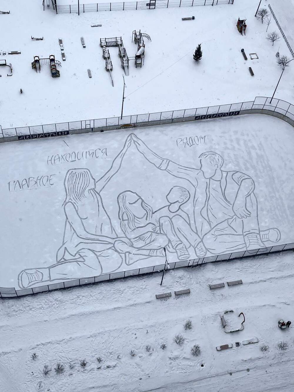 Художник из Екатеринбурга нарисовал на катке огромную картину, посвященную семье