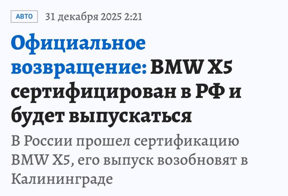 Производство BMW X5 возобновится в России. Калининградский «Автотор» оформил сертификацию сразу на четыре версии кроссовера: X5 xDrive40i, X5 xDrive30d, X5 xDrive25d и X5 xDrive40d.