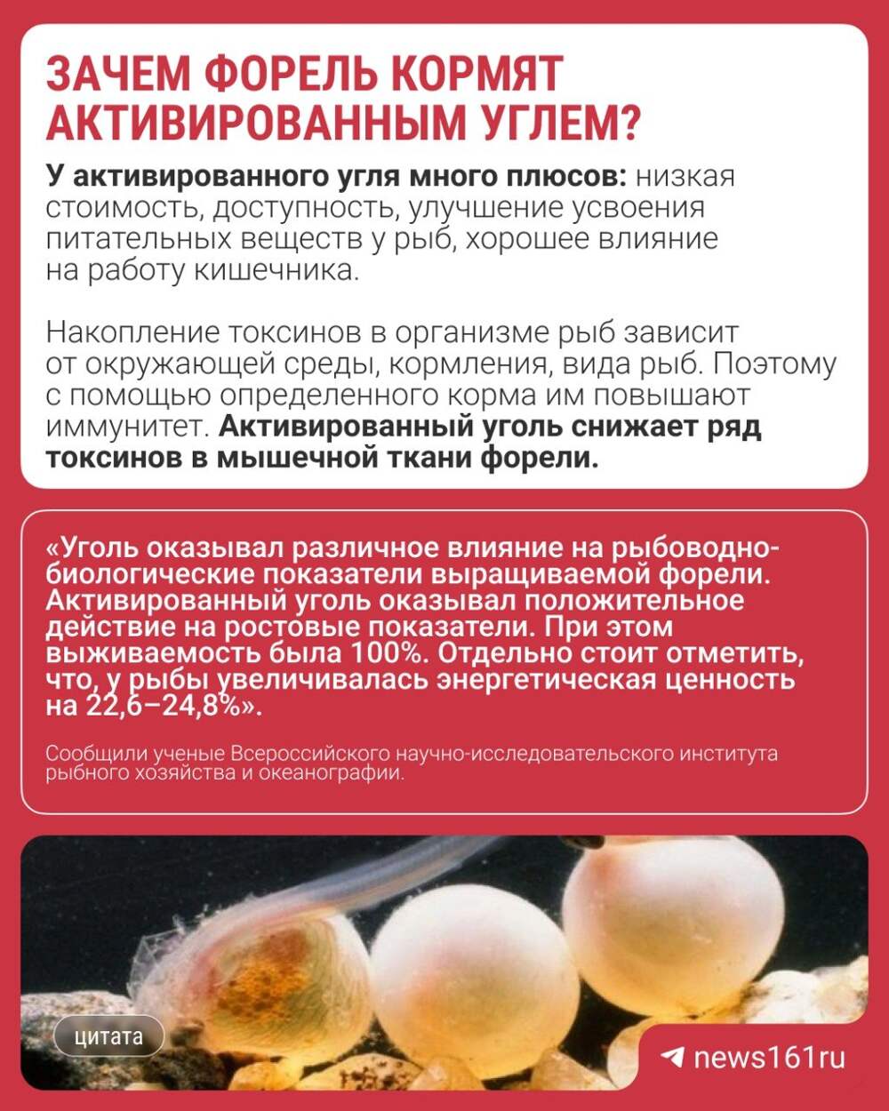 🧐 Учёные на Дону добавили в корм форели активированный уголь, это помогло улучшить качество выращивания и повысить жизнестойкость рыбы. Об этом читайте в карточке @news161ru 👆