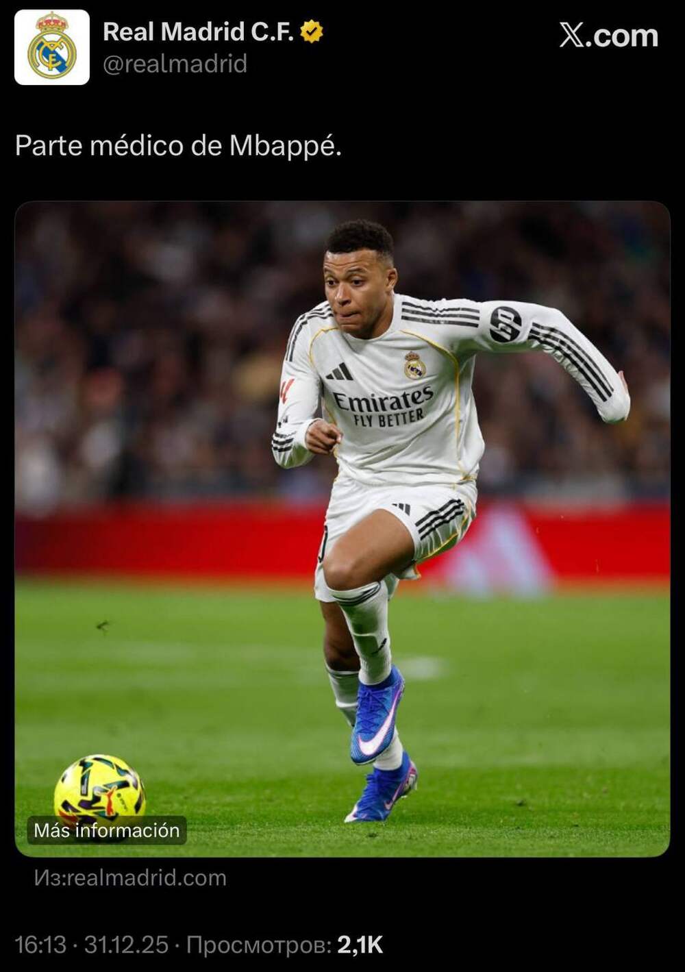 🤕 Француз изначально не считал травму серьёзной. Клуб также не стал проводить дополнительные тесты, хотя Килиан жаловался, что больше не может делать рывки на прежней скорости. 31 декабря «Реал» подтвердил растяжение связок колена