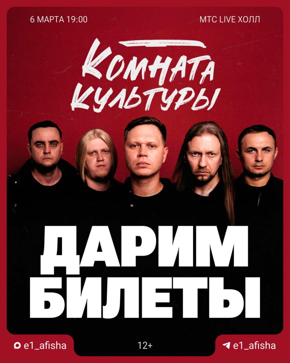 Дарим билеты на концерт «Комнаты культуры» 😍 Он пройдёт в «МТС Live Холл» 6 марта в 19:00. Чтобы выиграть, нужно: • подписаться на @e1_afisha и наш канал в МАX; • нажать на кнопку «Участвовать»; • отправить пост другу! Итоги подведет бот в тг-канале @e1_afisha 25 февраля. Будет один... Далее