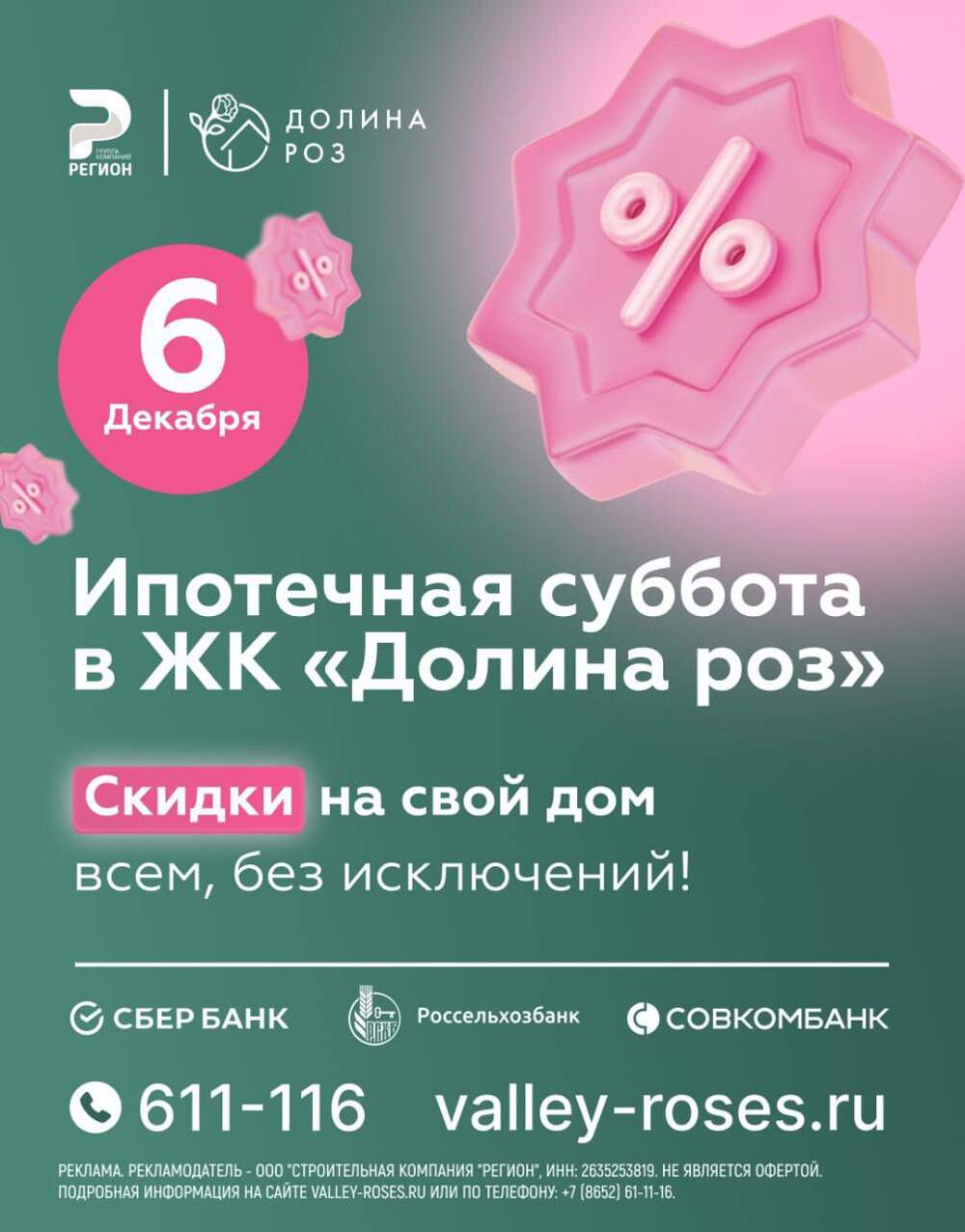 🔛 Включите выгоду на полную! Ипотечная суббота в ЖК «Долина Роз»! ✨ Мечтаете о своём доме, но откладываете из-за сложностей с ипотекой? 🗓 6 декабря в нашем отделе продаж вас будут ждать представители «СБЕР Банк», «Совкомбанк» и «Россельхозбанк». Они подберут для вас лучшие условия по...Далее