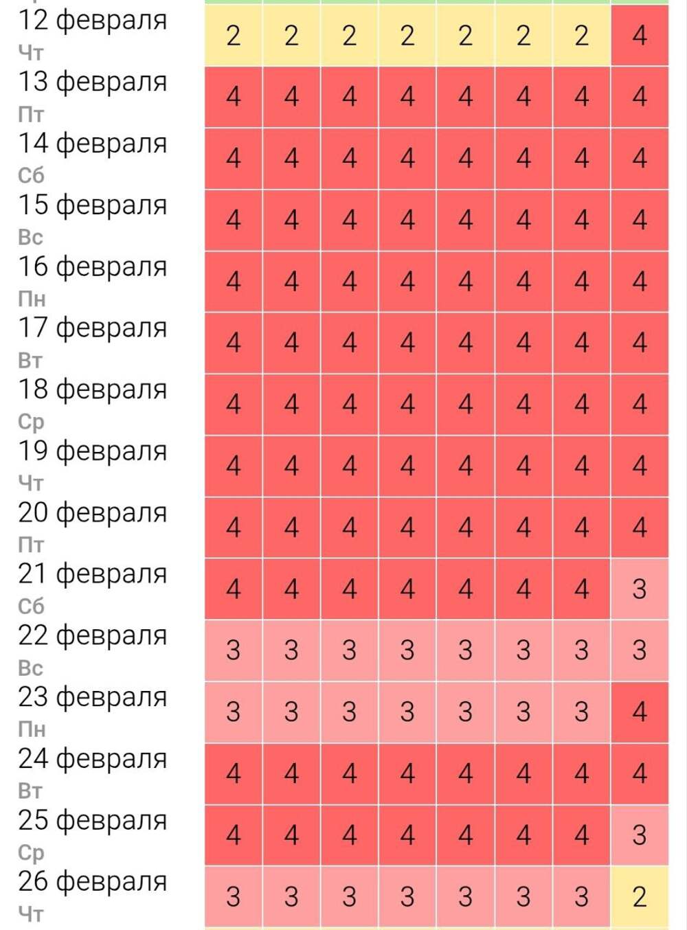 Пестрит в глазах? У админа тоже. Так выглядит календарь магнитных бурь на февраль. Согласно прогнозу, магнитная буря накроет нас 13 февраля и отпустит только 26 февраля. В этот период ожидается 3-4 балла. Короче, готовимся — запасаемся таблеточками от давления и успокоительными. ❤️... Далее