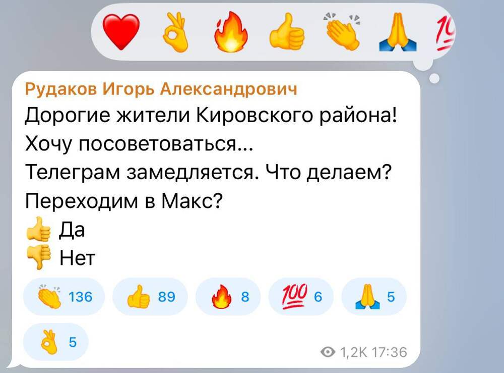 Чиновник из Самары запустил в своём Telegram-канале опрос о переходе в госмессенджер, но реакции с дизлайком там не оказалось😁 UFA_RB Подписаться| Прислать новость ❗️Напоминаем, чтобы не терять нас, подписывайтесь на резервный канал UFA_RB в Макс